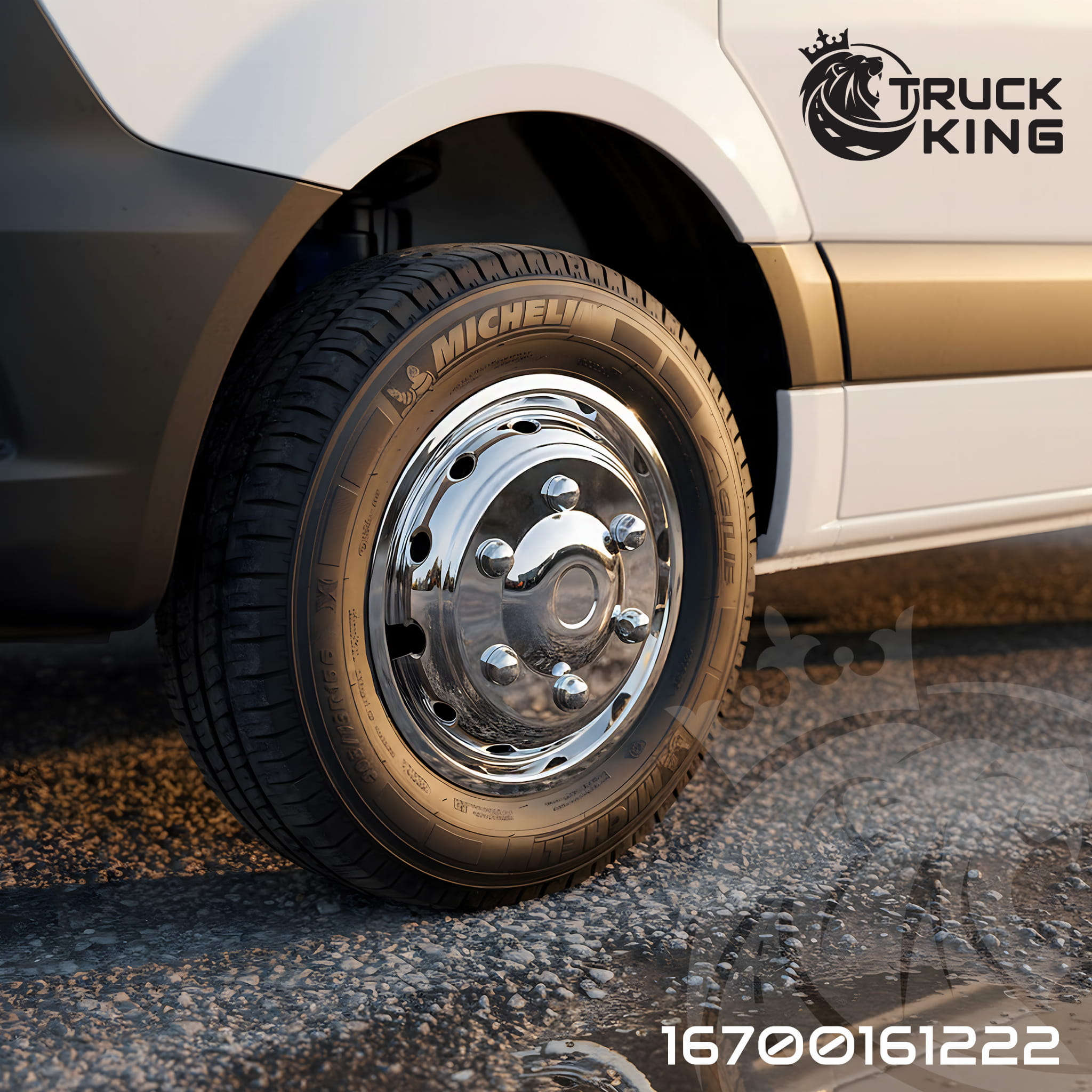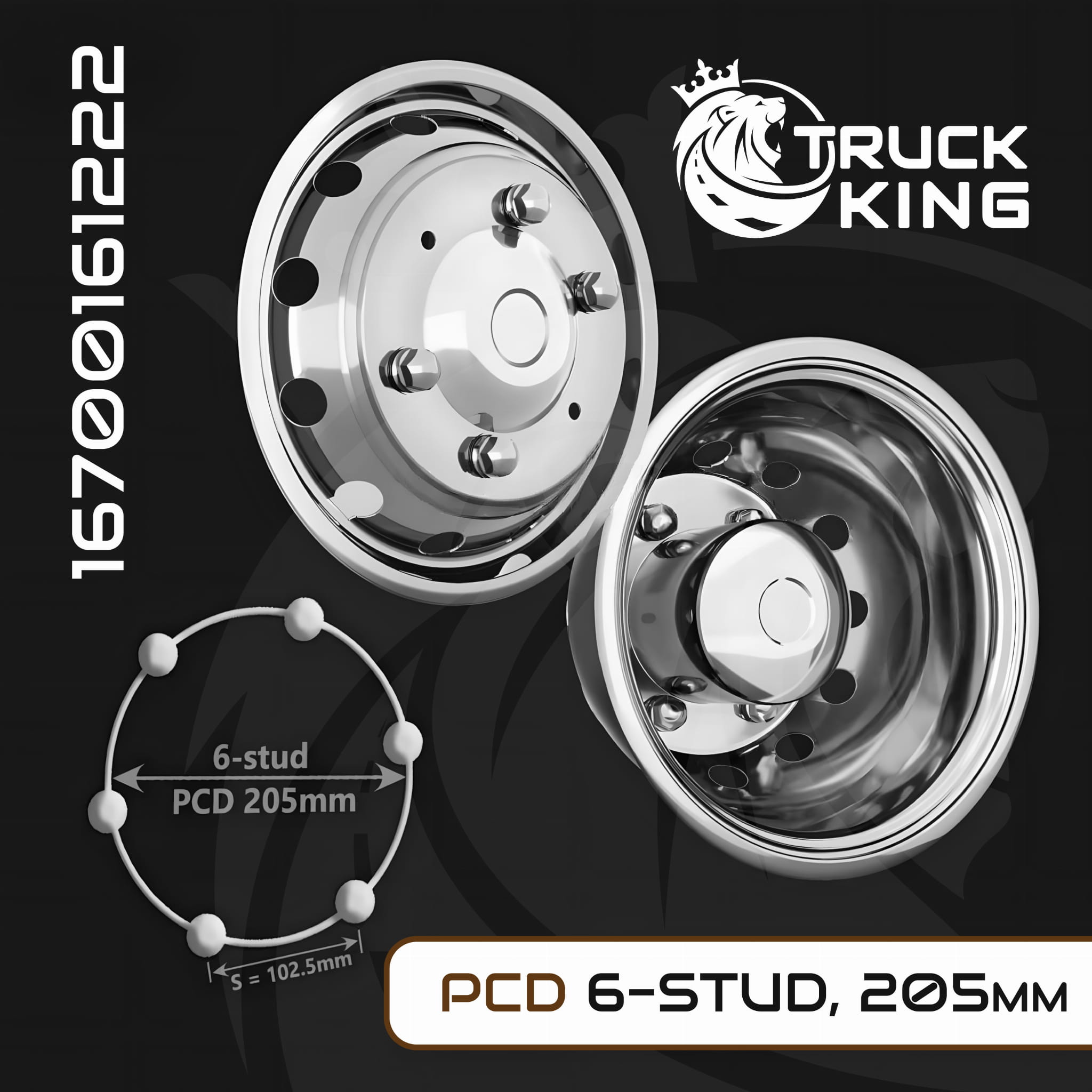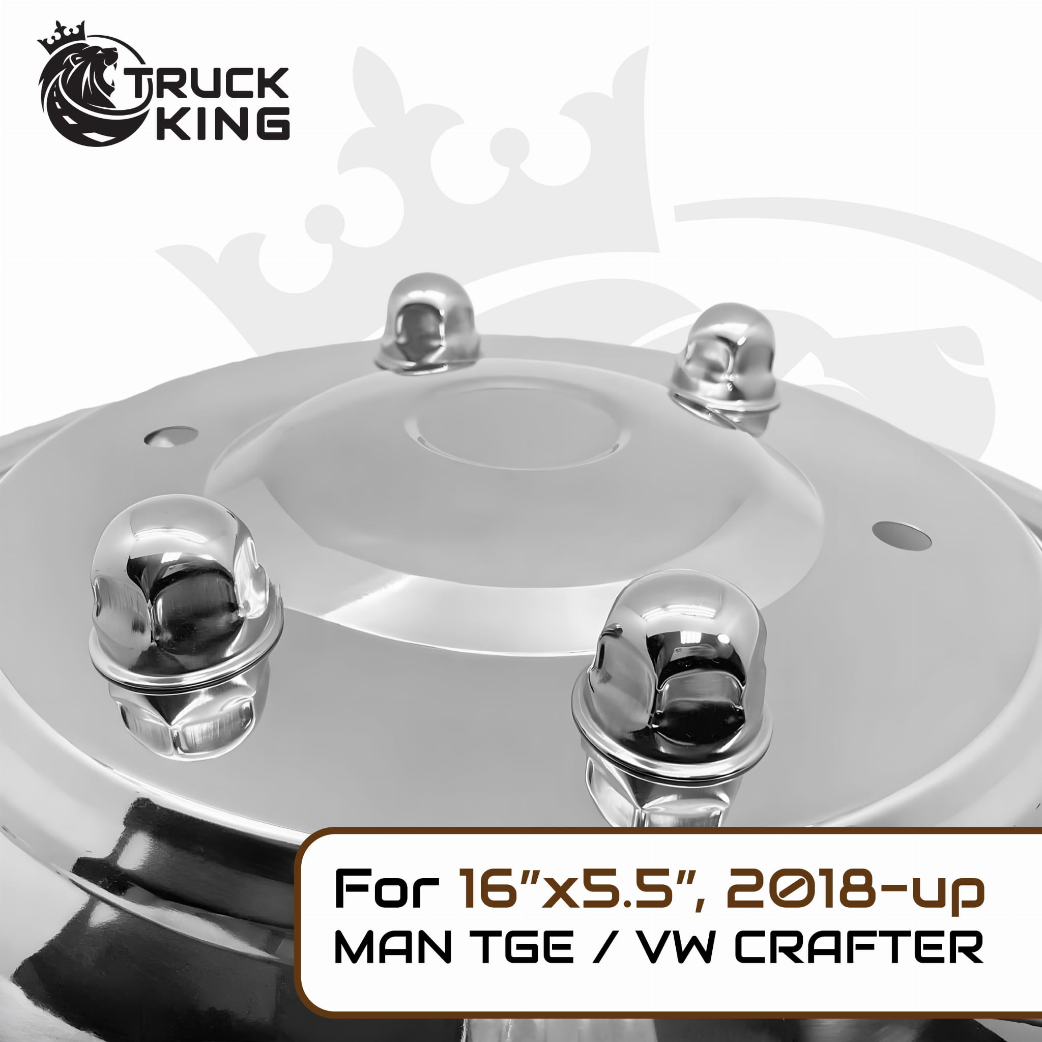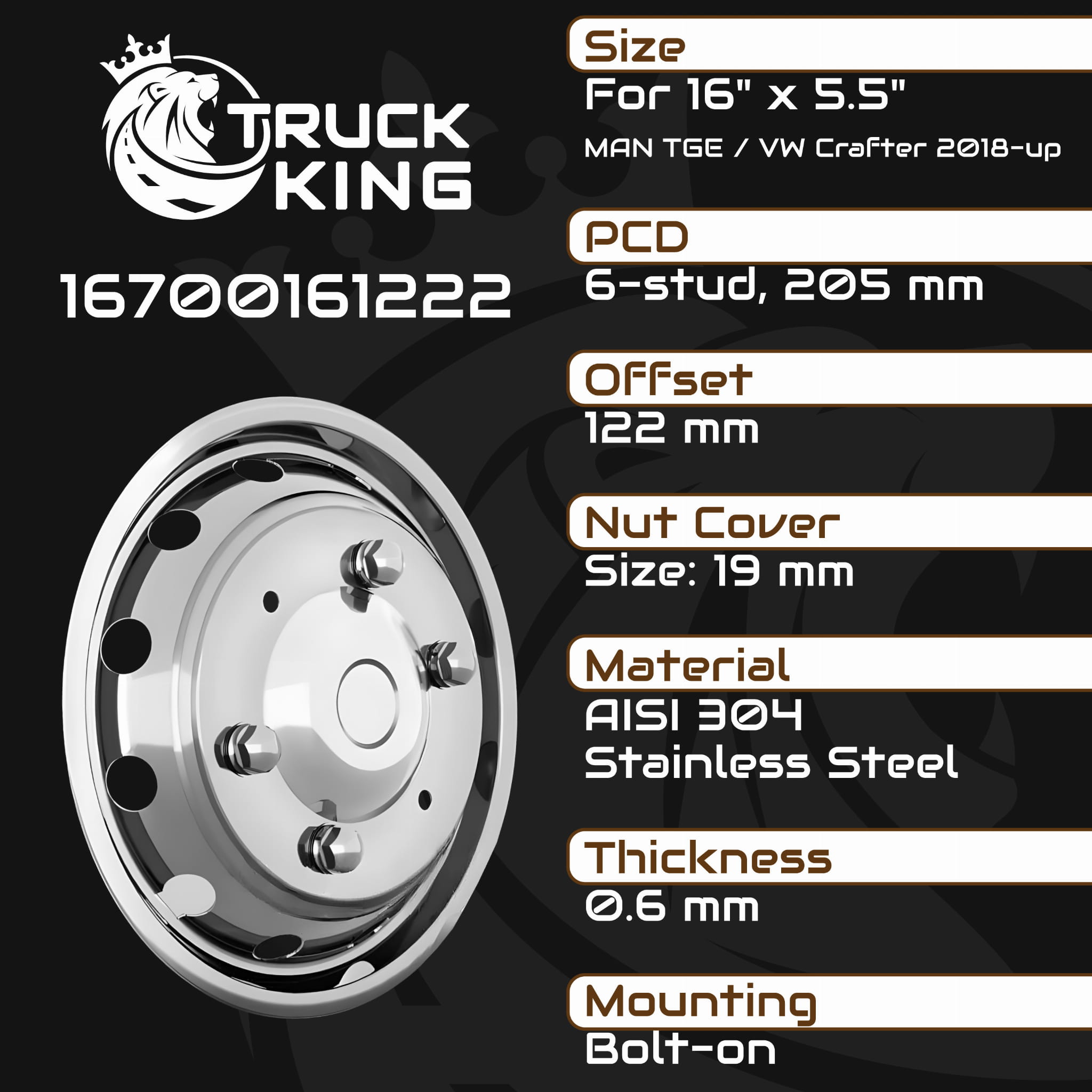 Komplet kołpaków na felgi 16x5,5, MAN TGE; VW Crafter (2018-), stal nierdzewna, mocowane na śruby, 12 otworów went., PCD 205mm, nr kat. 16700161222