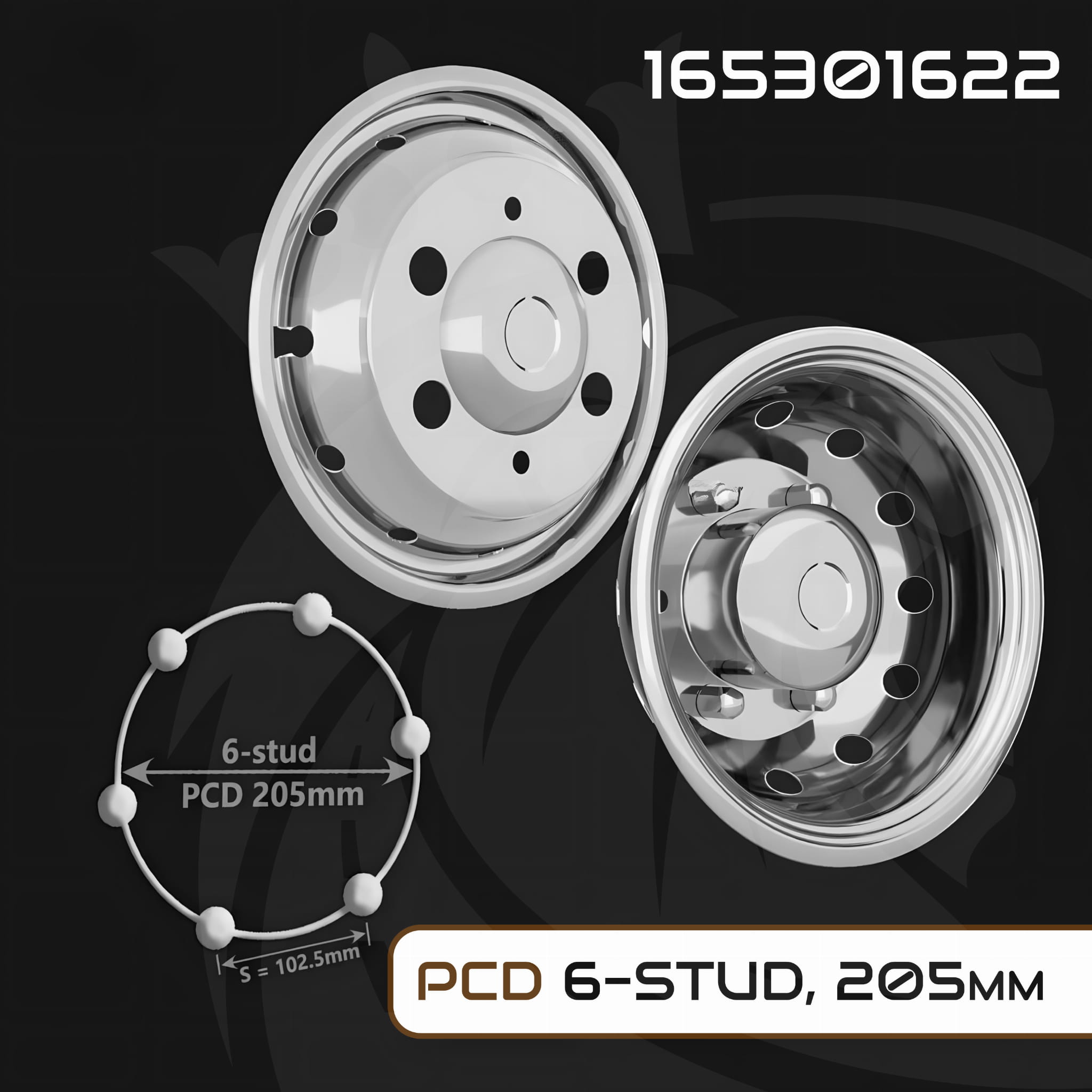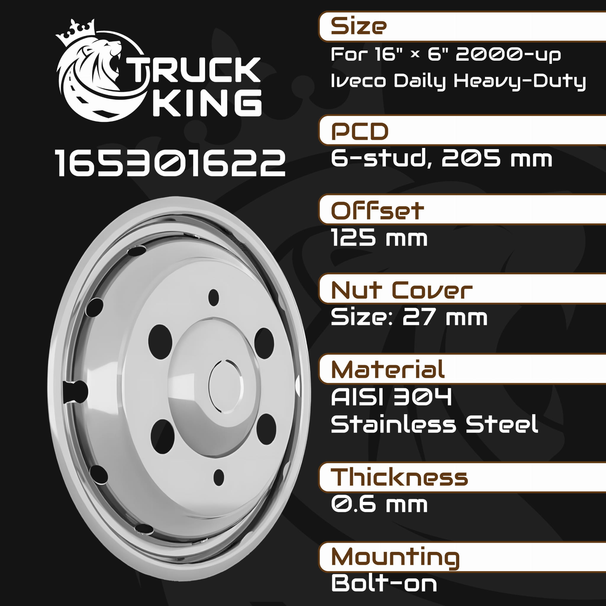 Komplet kołpaków na felgi 16x6, Iveco Daily (2006-), stal nierdzewna, mocowane na śruby, PCD 205mm, nr kat. 165301622
