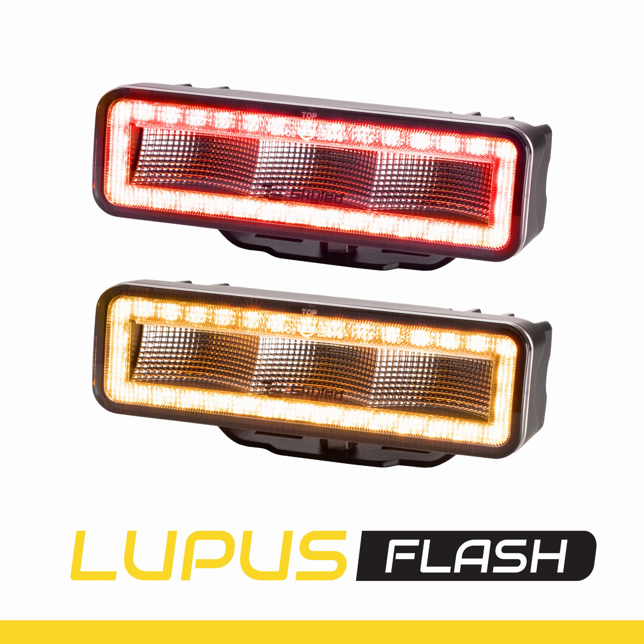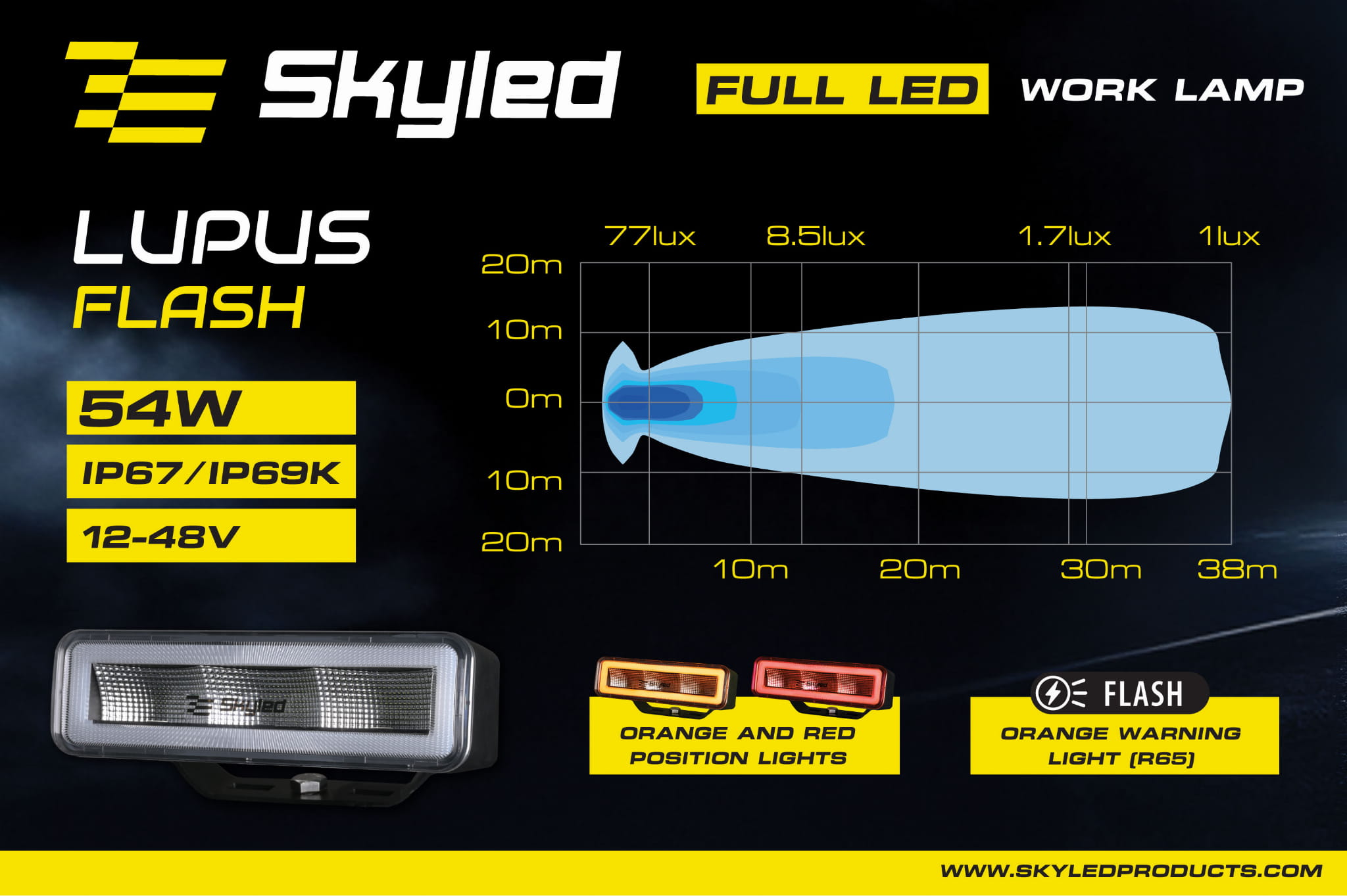 Lampa robocza SKYLED Lupus Flash 54F, 12-48V, 54W, 3100 Lm (światło rozproszone), światło ostrzegawcze (pomarańczowe R65), światło pozycyjne pomarańczowe/czerwone, nr kat. 13SL50612F
