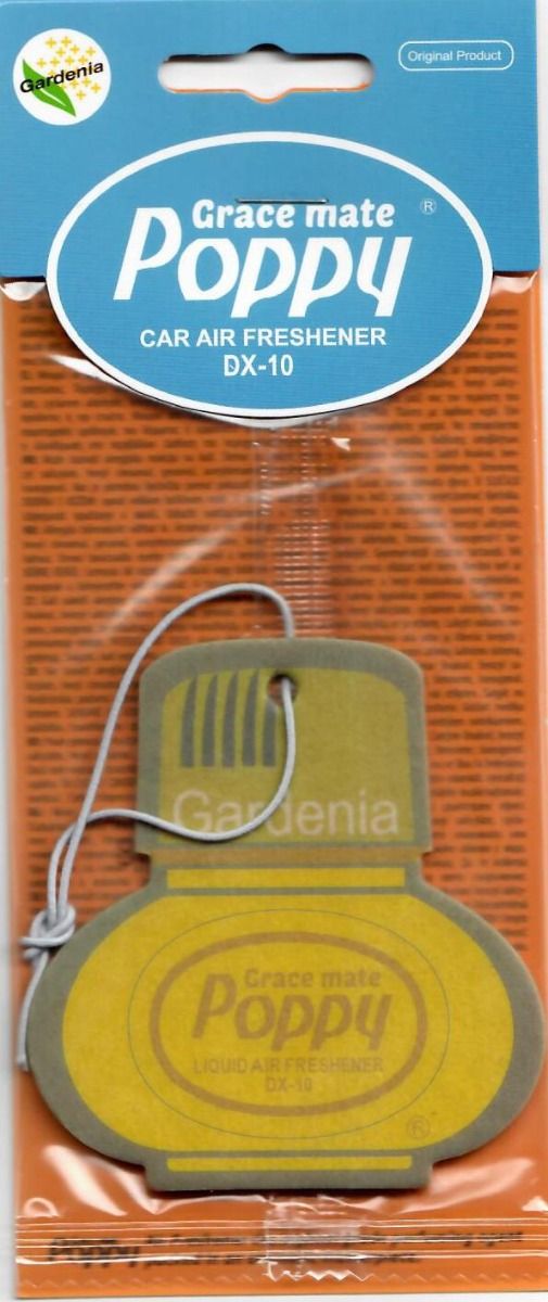Podwieszany oryginalny odświeżacz powietrza Poppy Grace Mate o zapachu gardenii. Wyprodukowany przez japońską firmę Diax – światowego lidera sprzedaży zapachów do pojazdów. Wysokiej jakości zapach zapewnia świeżość i przyjemną atmosferę w pojeździe. Przeznaczony do podwieszenia pod lusterko.