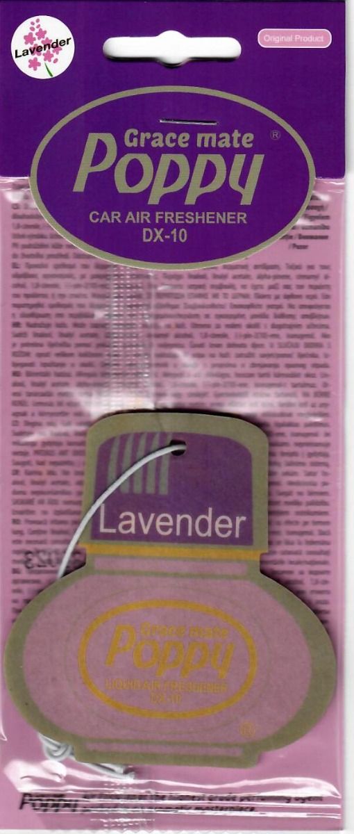 Podwieszany oryginalny odświeżacz powietrza Poppy Grace Mate o zapachu lawendy. Wyprodukowany przez japońską firmę Diax – światowego lidera sprzedaży zapachów do pojazdów. Wysokiej jakości zapach zapewnia świeżość i przyjemną atmosferę w pojeździe. Przeznaczony do podwieszenia pod lusterko.