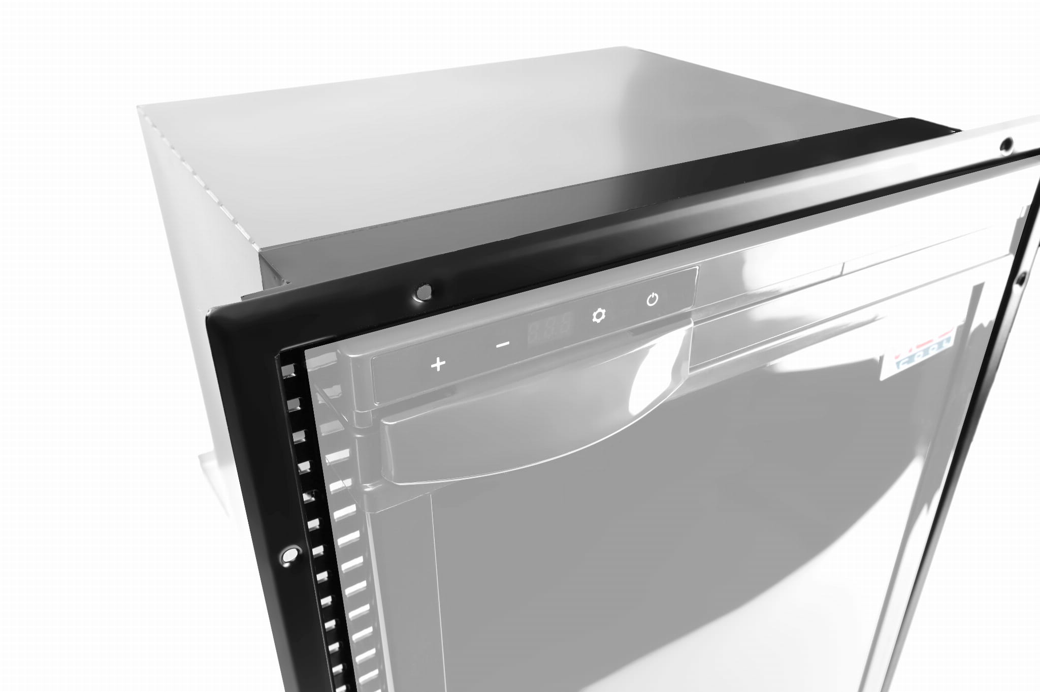 Otwory mocujące ramkę spasowane są z otworami montażowymi po bokach lodówek.