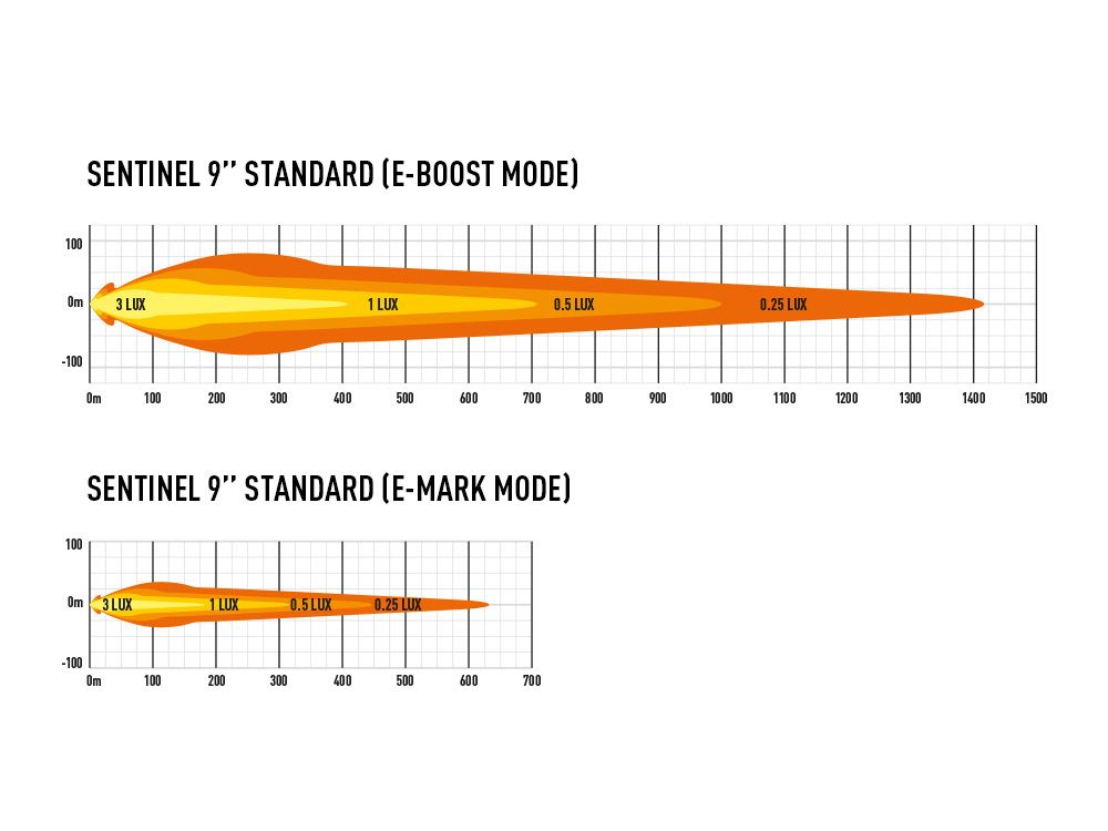 Lampy emitują 9520 nieprzetworzone lumeny o natężeniu 1 luksa na odległość 707 m, ale ich największym atutem jest 52-stopniowy poziomy zasięg światła oraz widoczność na poboczu drogi lub toru na średnim i dużym dystansie. Moc oświetlenia można pokazana jest na zdjećaich. Tak jak we wszystkich produktach marki Lazer, temperatura barwowa wynosząca 5000 K jest przyjemna dla oka, a jednocześnie zapewnia maksymalną ostrość i wyrazistość obiektów znajdujących się przed nami. Dzięki zastosowaniu technologii podwójnego wyjścia E-Boost firmy Lazer lampa posiada homologację dla światła drogowego EKG ONZ zgodnie z regulaminem nr 112. Przy 100% mocy światło przekracza dozwolony przez ECE poziom, dlatego moc można zmniejszyć, wyjmując tylną wkładkę wzmacniającą.