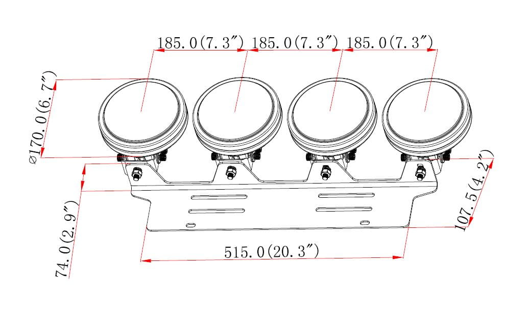 Uniwersalny uchwyt na dodatkowe lampy, który pasuje do tablic rejestracyjnych UE. Mocowanie może pomieścić 4 dodatkowe reflektory dalekosiężne o maksymalnej szerokości 180 mm. Idealnym rozwiązaniem, będą wersje okrągłych reflektorów dalekosiężnych 7". Uchwyt jest przeznaczony do montażu za tablicą rejestracyjną. Odległość między otworami montażowymi oświetlenia wynosi 185 mm, co zapewnia możliwość montażu większości okrągłych reflektorów dalekosiężnych o srednicy 7" dostępnych na rynku.