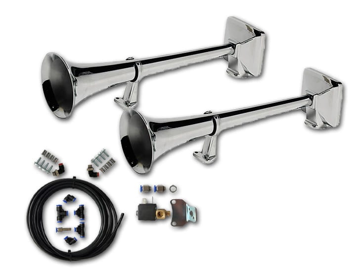 Komplet dwóch sygnałów pneumatycznych okrągłych, wykonanych z cynku wykończonego chromem. Wyprodukowane przez firmę HADLEY. Przeznaczone do pojazdów z instalacją pneumatyczną. Sygnały Hadley posiadają niespotykany design i indywidualny dźwięk, dlatego są rozpoznawane na całym świecie. W komplecie pełen zestaw montażowy oraz elektrozawór 24V.